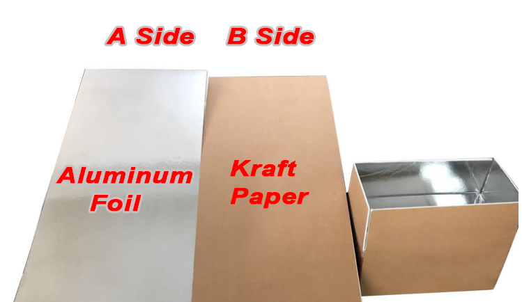 Aluminum foil cardboard is made of vinkin and aluminum foil composite in PS core, the core reaches 220g/m2, low temperature resistance, strong anti-falling ability, not easy to deform, cold chain transmission is not layered.