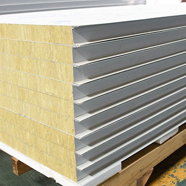 采用中高密度巖棉為芯材,鍍鋅(不銹鋼)或彩涂鋼板為面層結(jié)合高強(qiáng)度粘劑,通過(guò)高速連續(xù)自